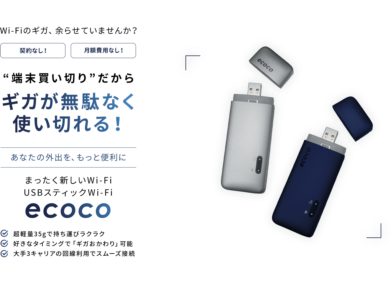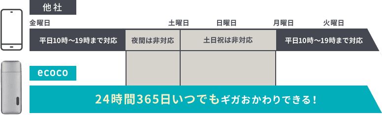 多くのポケット型Wi-Fiは月額料金がかかりますが、「ecoco」は一括購入のみの「買い切り端末」。契約期間や解約金などに縛られることなく、ご購入時の「1度の支払いのみ」でご自分のペースに合わせて自由にお使いいただけます。