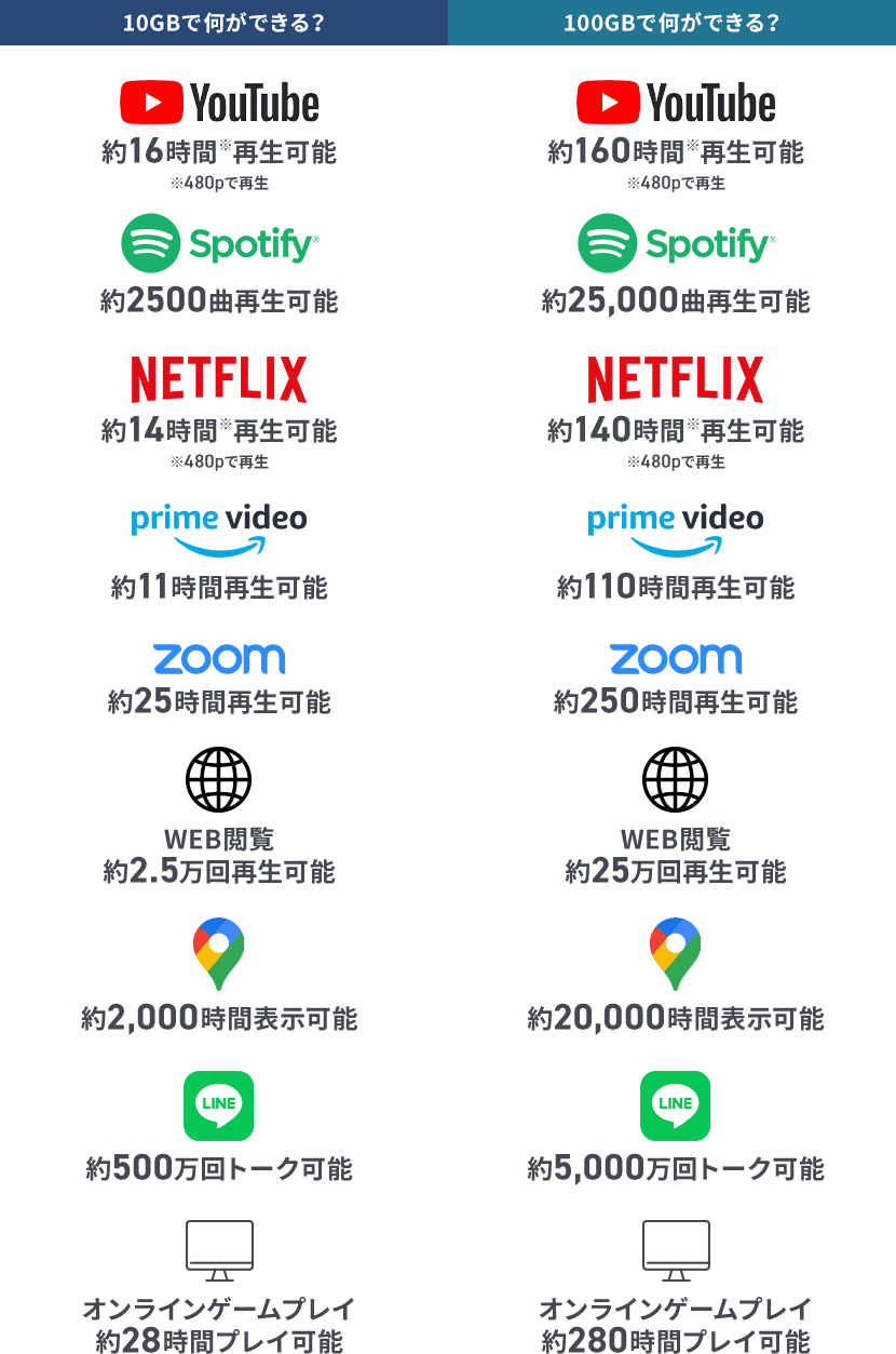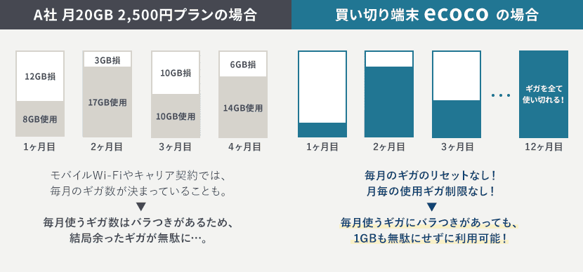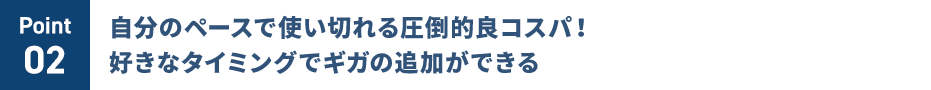 「毎月のデータ容量の余り分」が発生しません。長期的に見ると、非常にコスパ良くご利用いただけます。