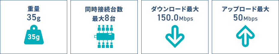 | 最大通信速度 | CAT4DL150Mbps、UL50Mbps | |